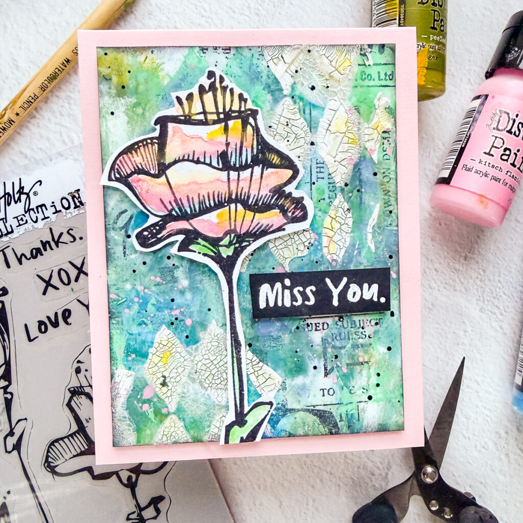 For my card this week, I created a background with Distress Paints and Collage Paper. Then I added Distress Opaque Crackle Texture Paste through the Tracy Evans Distressed Background Snippet stencil. To finish my card, I stamped and colored a floral image and sentiment from the Tim Holtz Abstract Florals stamps.