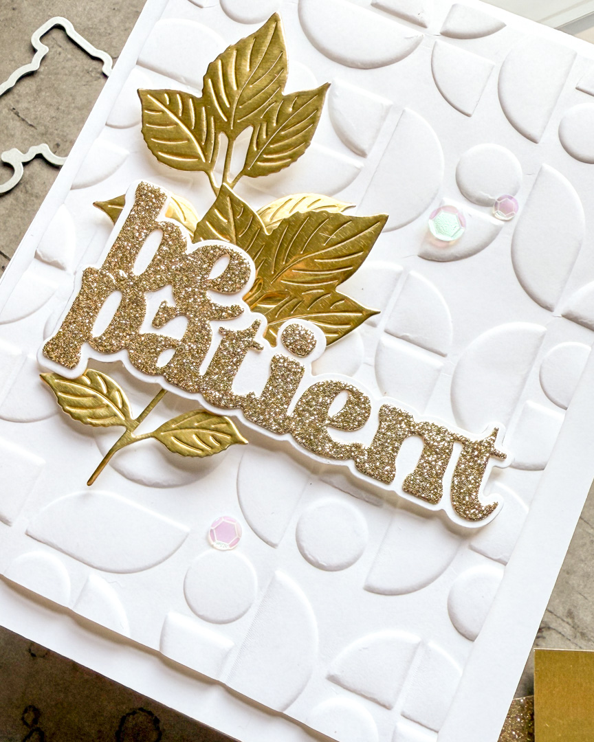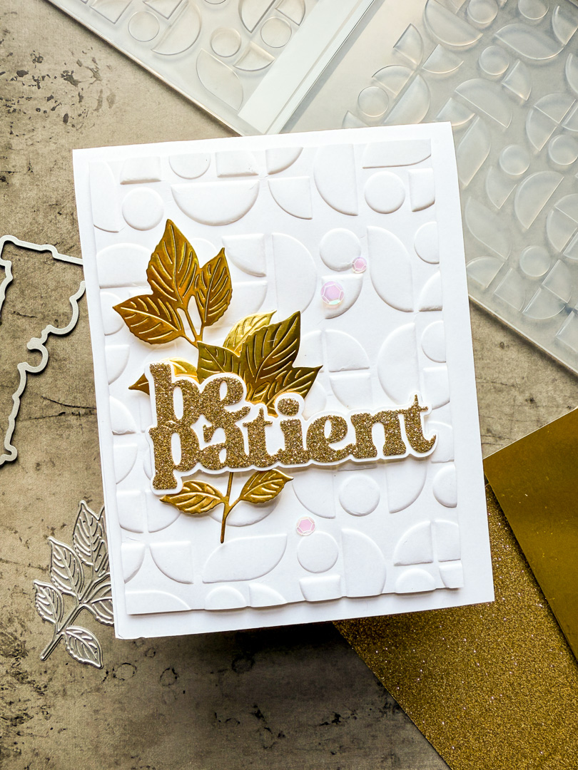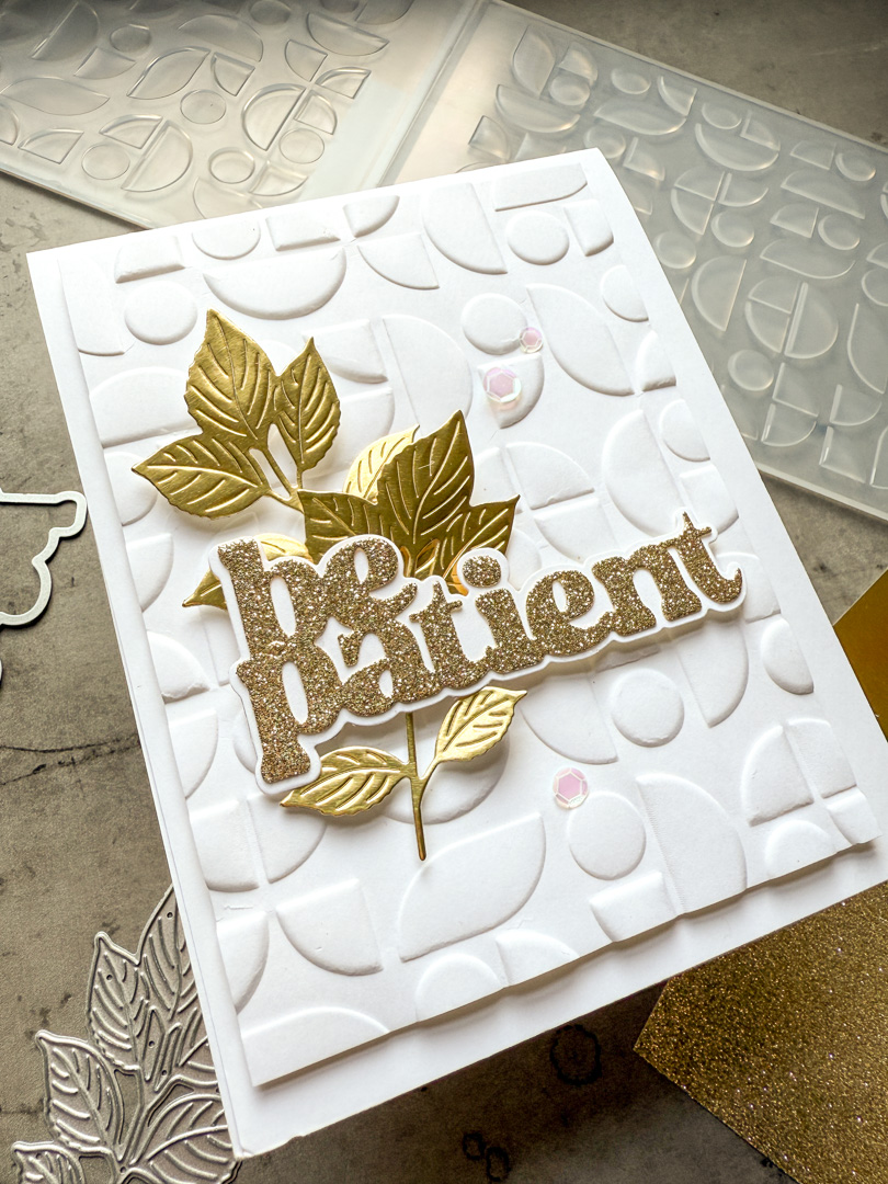 This week our challenge is Add Some Metal and I have used some metallic and glittery cardstocks to create my card. I cut a panel and embossed it with the Mid-Century Ethereal die . I die cut some leaves from the Autumn Leaf Branch Wafer Die from Gold Matte Cardstock, and finally I added a sentiment using the Be Patient die cut from metallic cardstock.