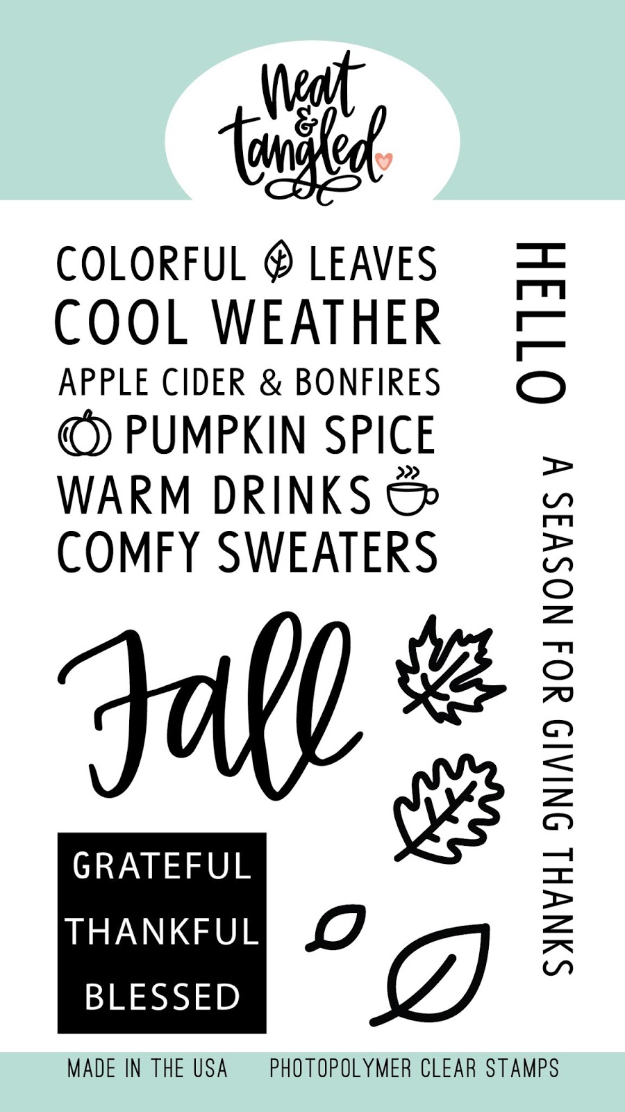 Hello crafty friends and welcome to Day 1 of the Neat and Tangled release. Today we are showcasing the Hello Fall set…Hello Fall is a 4×6 that is sure to get you ready for the change of seasons – a lovely hand lettered "Fall", paired with a variety of matching sentiments. Cool weather, comfy sweaters and falling leaves are on their way – be ready with this set!