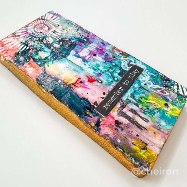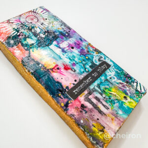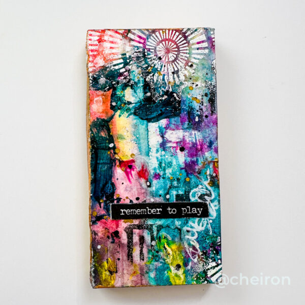 Collage, paint, gel medium, acrylic inks on mini 2 x 4 inch canvas. Gold painted sides. “Remember to Play” quote.