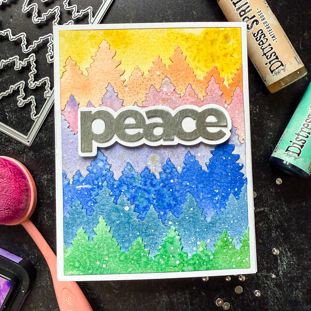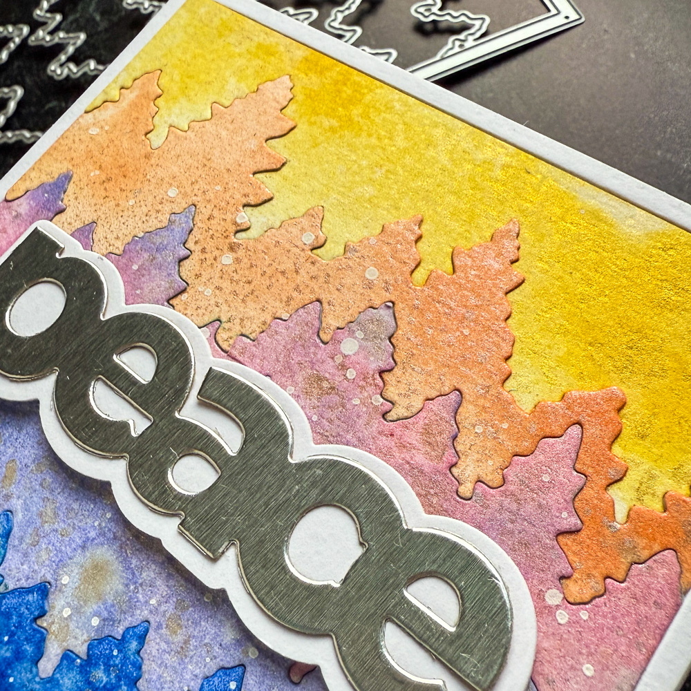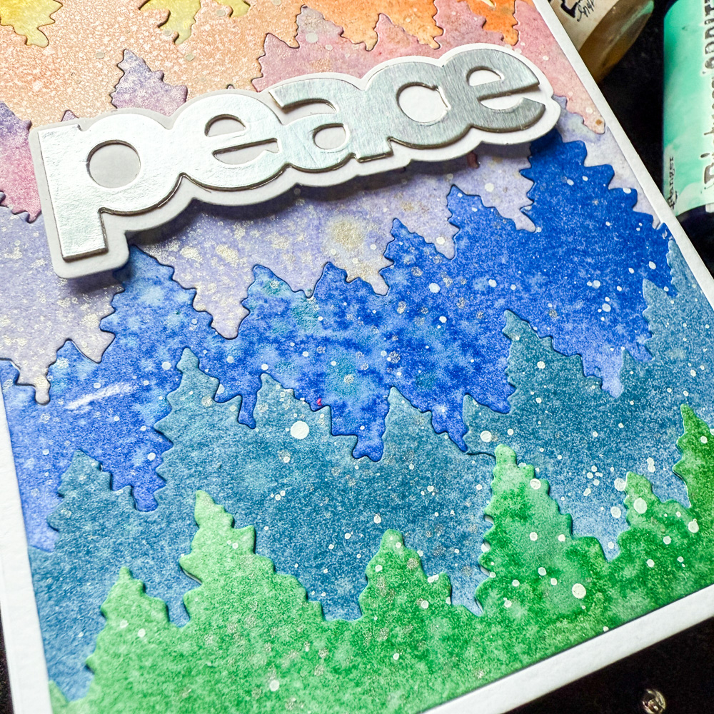 For my project today, I wanted to make a fun holiday card for some of the people I send cards to that do not celebrate Christmas and I thought that I would use the new Forest Background to create a peaceful winter scene. I ink blended each layer of the background, sprayed each one with a coordinating color of Distress Spritz for some shimmer and shine, then added Sterling Foundry Wax splatter and white splatter.