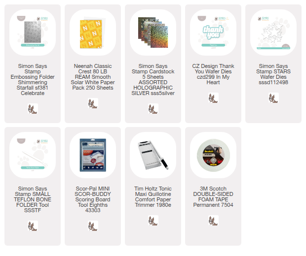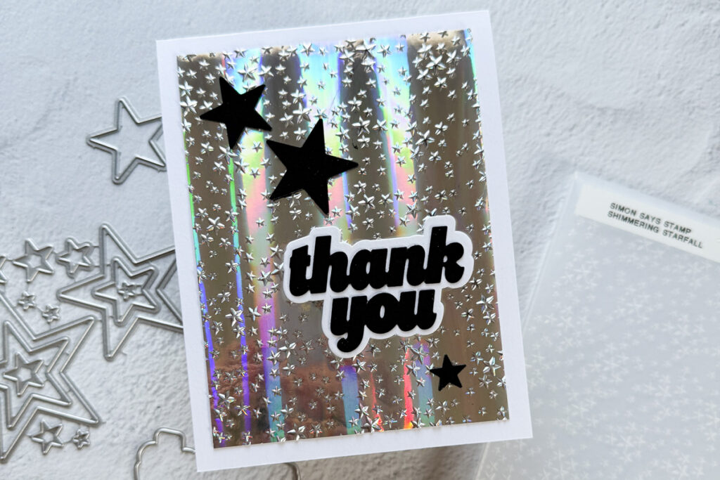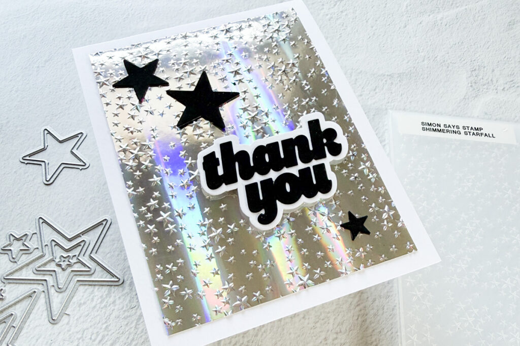 Hello crafty friends and welcome to another Simon Says Stamp Monday Challenge. Thanks to all who played along with us last time and we hope you will join us this week too. This week our challenge theme is Emboss It and I’ve used the Simon Says Stamp Shimmering Starfall Embossing Folder to create a quick and easy card. I embossed some Holgraphic Silver cardstock and adhered it to my card. Then I added a simple sentiment using with CZ Design Thank You die and added a few die cut Stars.