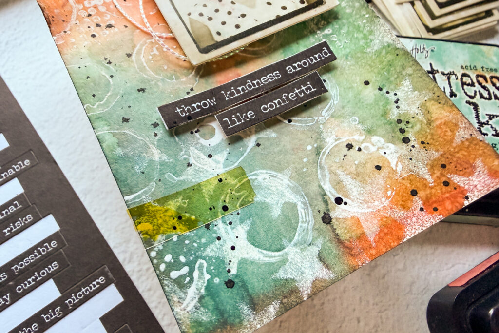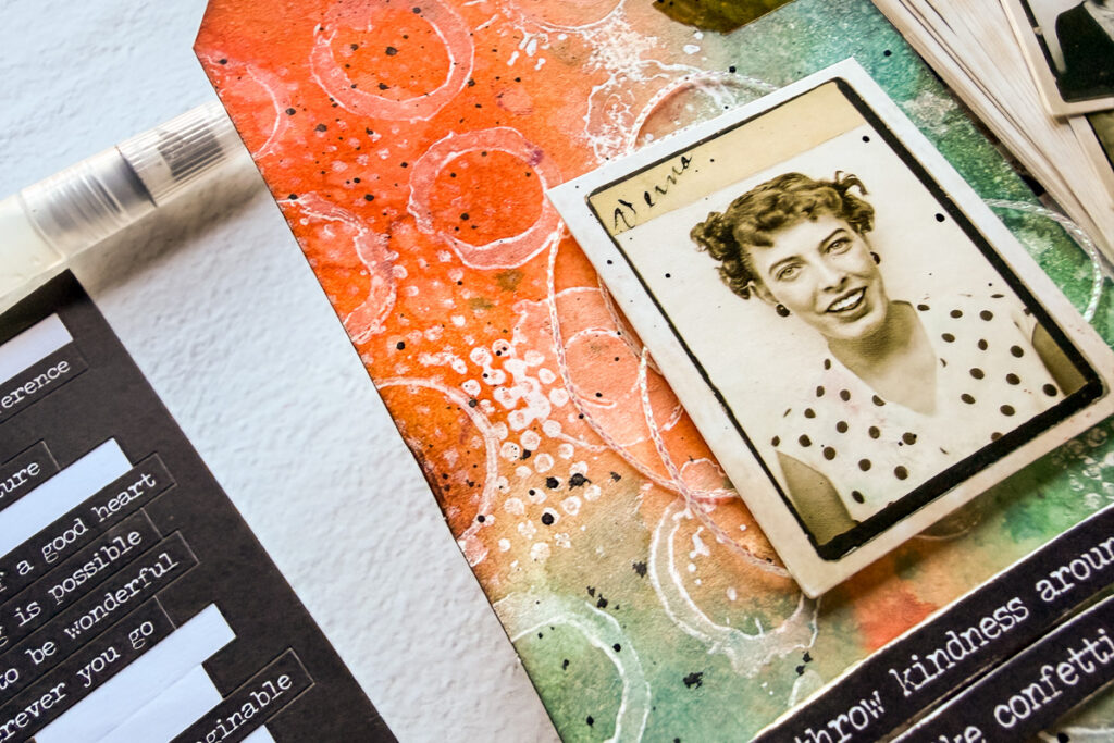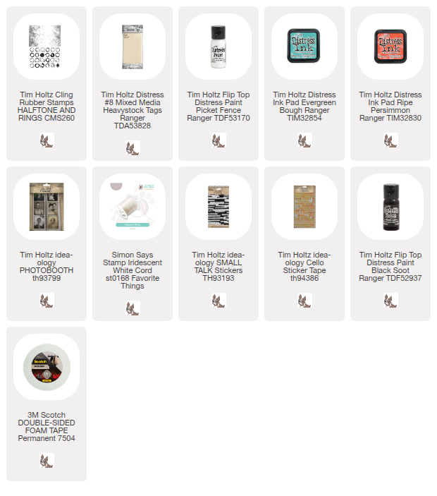 Hello crafty friends and welcome to another Simon Says Stamp Monday Challenge. Thanks to all who played along with us last time and we hope you will join us this week too. This week our challenge theme is Not A Card and I’ve used one of my favorite Tim Holtz stamp sets, Halftone and Rings to create a fun resist background. I stamped it in Picket Fence Distress Paint then Blended Ripe Persimmon and Evergreen Bough Distress Inks over it. I inked the edges, added some Cello Sticker Tape and Black Soot Paint Splatter. I finished my tag with a Photobooth Photo, some Simon Says Stamp Iridescent White Cord and a Small Talk Sticker.