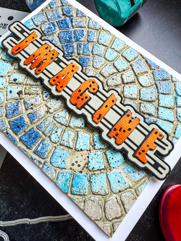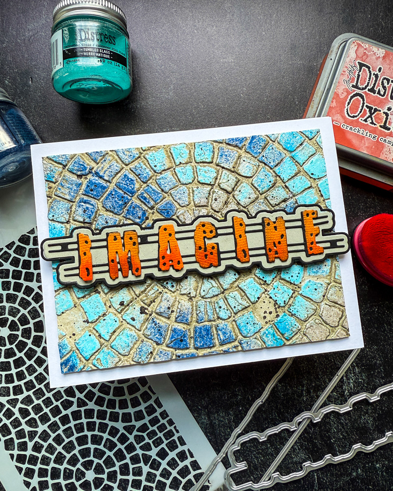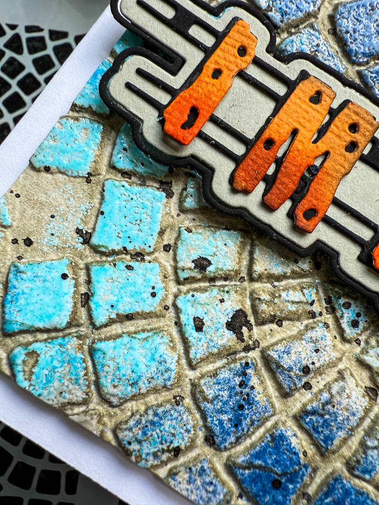 Our challenge this week is Summertime Blues and I have created a background with the Tim Holtz Mosaic stencil, Distress Opaque Texture Paste, and some of my favorite blue Distress Embossing Glazes, Tumbled Glass and Prize Ribbon. I spread the paste through the stencil (be sure to clean it off after!). Then I added the different colors of Distress Embossing Glaze and heat embossed them when they were dry.