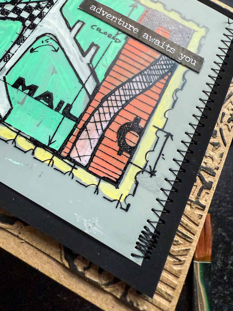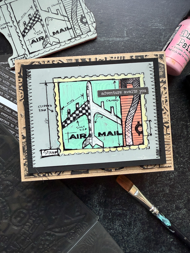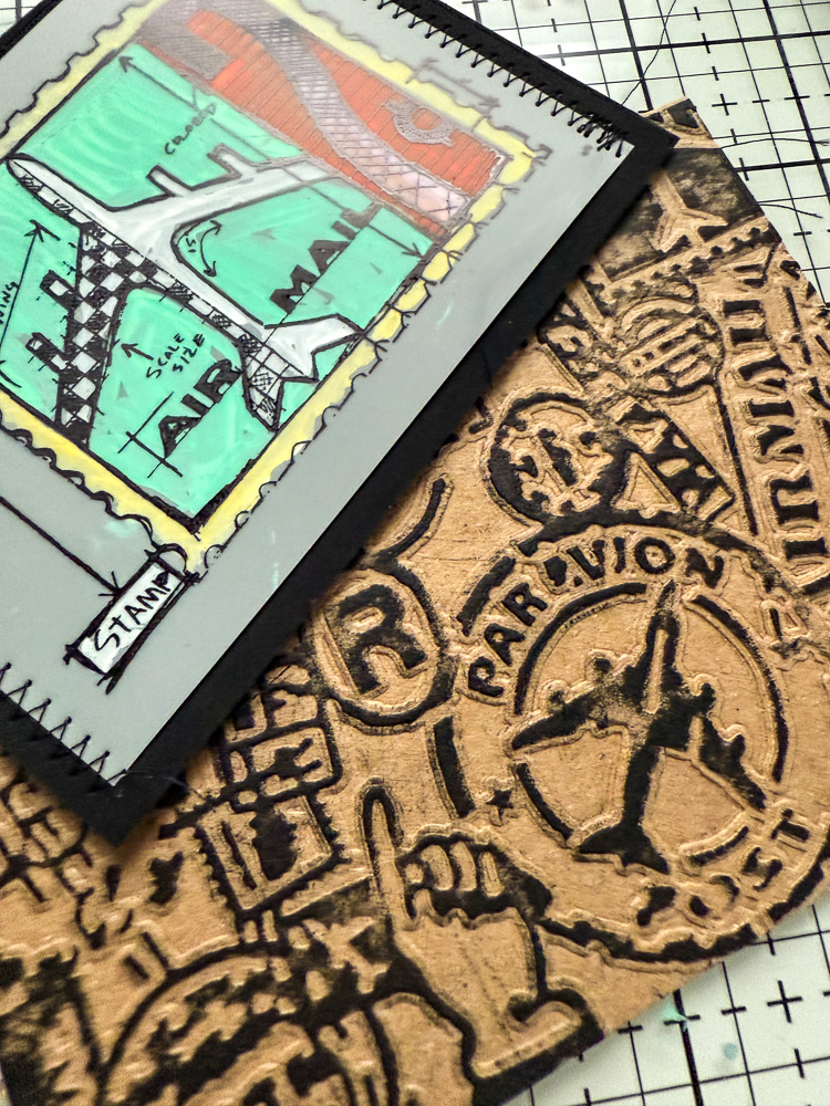 Our challenge this week is Vacation! This week I have created a card using the Tim Holtx Stampers Anonymous Travel Blueprint Stamps. I stamped the image onto a piece of matte artist film with StazOn ink. Then I turned the image over and painted on the back with Distress Paints. I sewed the image onto some black Ranger Matte Cardstock then added onto a piece of kraft cardstock that had been embossed with the Vault Airmail embossing folder. I mounted the entire piece onto a kraft cardstock notecard then added a Small Talk Sticker.