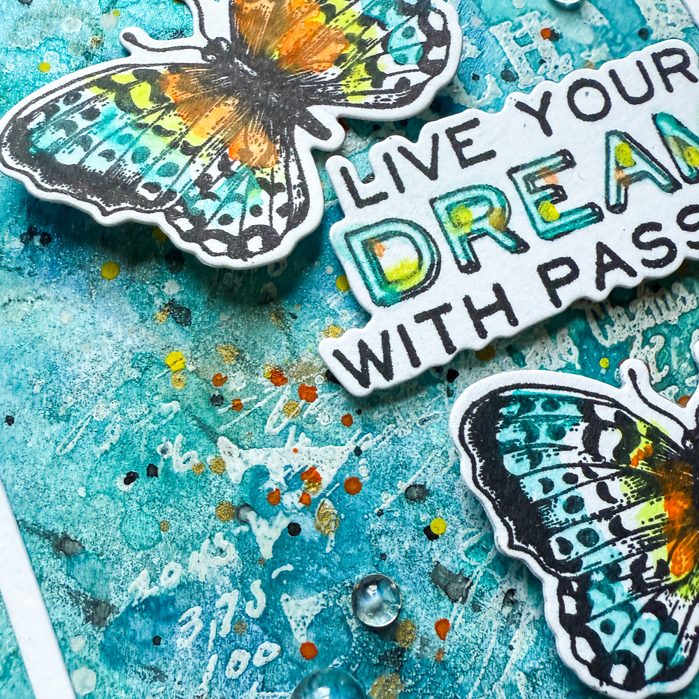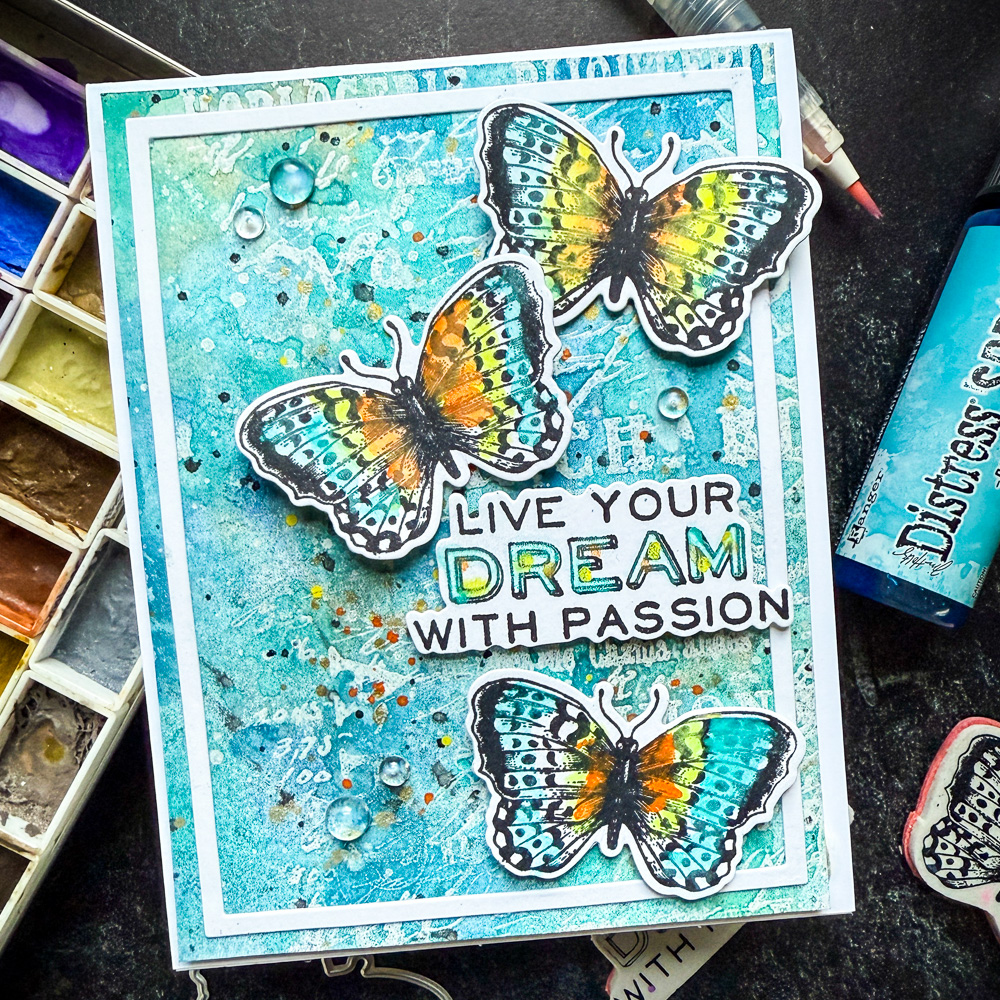 I have a fun project for you today featuring the stamps and dies from 3 of stamp sets. I stamped and heat embossed the background from the Papillon set onto my panel. Then I watercolored over it with some of the pigments from my Distress Watercolor Shavings Palette, and sprayed it with Distress Spritz. I added some splatter with the pigments and also with some Gilded Foundry Wax. I cut the sentiment from the Perspective stamp set using the coordinating dies. I also stamped and cut the butterflies using the stamps and dies from the Flutter set, then colored them in with my shavings palette and a waterbrush. I arranged all of the die cuts over a Simon Says Stamp A2 Frame and added the sentiment on top.